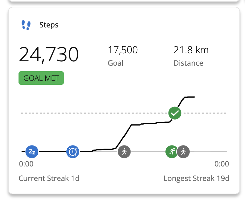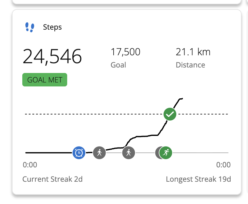 i am playing a 3-day chess tournament starting tomorrow so i decided to update this week's progress earlier. i'm at a blistering ~168k steps so far, around ~20k steps ahead of schedule. since i'm not allowed to have/wear electronics in the playing hall during my games i will likely lose ~20k steps over the 3 days due to not being able to track. i still plan to do a more sustainable ~15k pace regardless. next update next Thursday