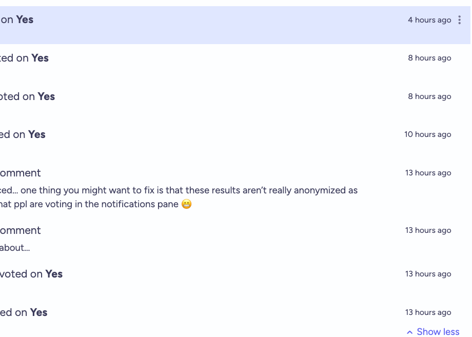 @ian just noticed… one thing you might want to fix is that these results aren’t really anonymized as you can see what ppl are voting in the notifications pane 😬
